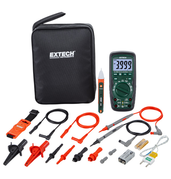 Kit de multímetro industrial de alta resistencia. Incluye los productos de los modelos EX505A, DV25 y TL808 de Extech. El cual le proporciona un medidor confiable y todos los accesorios necesarios para la resolución de problemas eléctricos industriales. Los productos se suministran en un estuche de transporte blando que proporciona protección y organización para los medidores, siempre que se necesiten.