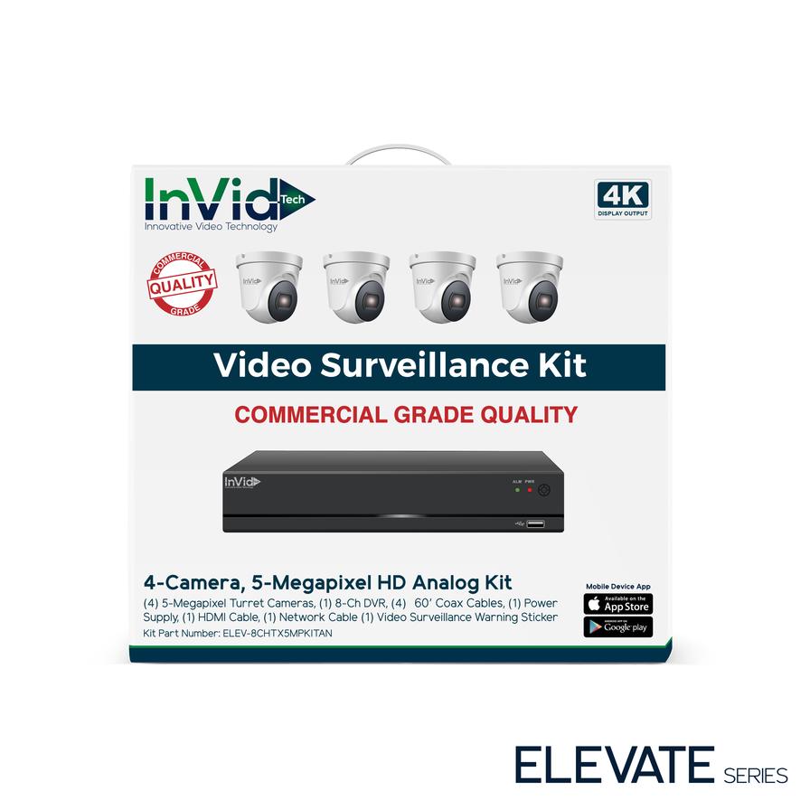 KIT DE 4 CÁMARAS ANALÓGICAS HD: INCLUYE (4) CÁMARAS TURRET DE 5 MEGAPÍXELES, (1) DVR DE 8 CANALES, (4) CABLES DE 30M, (1) FUENTE DE ALIMENTACIÓN, (1) CABLE HDMI, (1) CALCAMONIA DE ADVERTENCIA DE VIDEOVIGILANCIA.